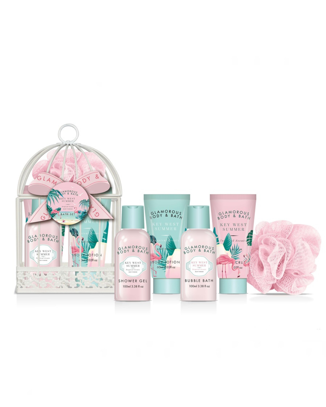 Glamorous White Cage Body Powder – σετ δώρου σε πανέμορφη συσκευασία μεταλλικού κλουβιού και άρωμα καρύδα.